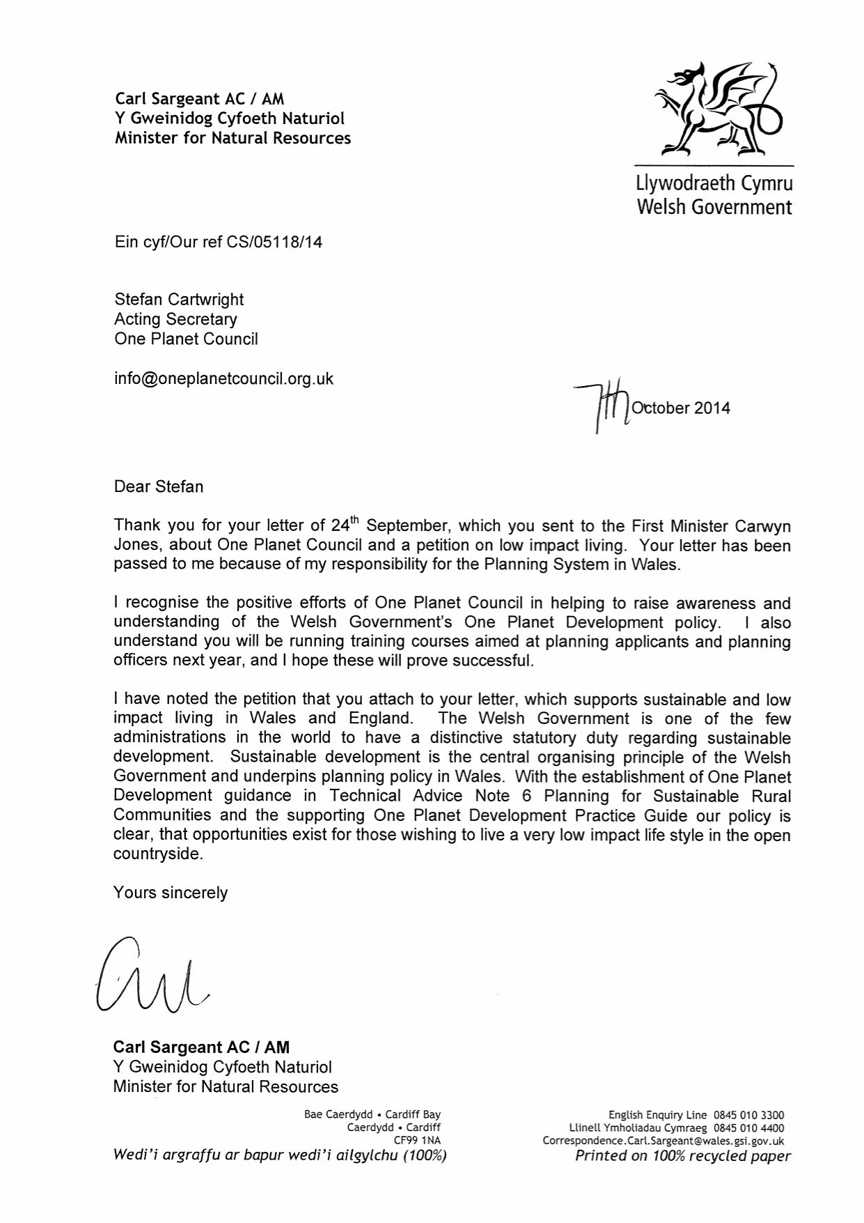 In response to a recent letter, Carl Sargeant, minister responsible for planning in Wales, acknowledges the work of the One Planet Council and confirms the Welsh Government’s commitment to the One Planet Development policy and low impact living in the open countryside.